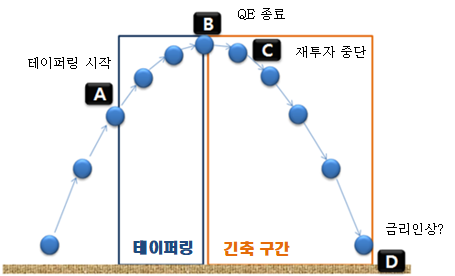 테이퍼링은 양적완화를 축소하겠다는 의미이다. 경기가 나아지기 시작하면 양적완화를 줄이는 출구전략으로 매입하던 채권을 줄여나가는 정책이다.