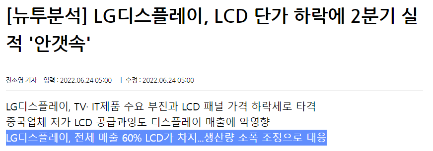 OLED가 많다하지만, 60% 이상이 LCD이다. LG디스플레이 LCD사업부가 어떻게 될지는 사실 이미 정해진 미래처럼 보인다.