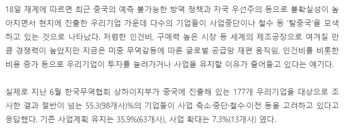 삼성전자의 경우 중국의 현지 고용인원이 2017년에 3만7천명정도 였으나 1만8천명으로 이미 줄었다.