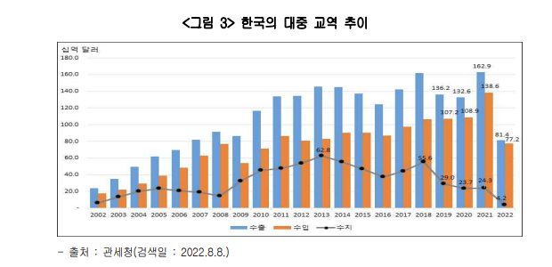 이게 단순 경기변동의 문제가 아니라는 뜻이다. 반도체 무역수지를 묶어서 보면 올해 상반기 143억달러흑자를 기록했는데 기타 집적회로반도체 수입은 7억달러에서 11억달러로 증가헀다. 메모리반도체분야에서는 여전히 경쟁력이 있으나 나머지 반도체 수출은 늘고 있다는것이다.