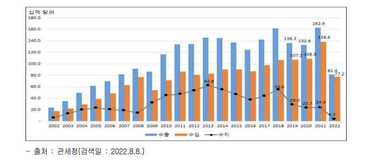 그러나 2022년 기준 1629억달러, 10배가까이 늘었고 수출비중도 25%가 되었다.