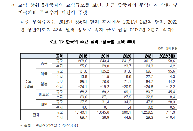 한국의 주요 교역대상국별 교역추이를 보면 기타 정밀 화학 원료 수입이 2배가까이 늘었다. 2차전지 배터리 원료이다.